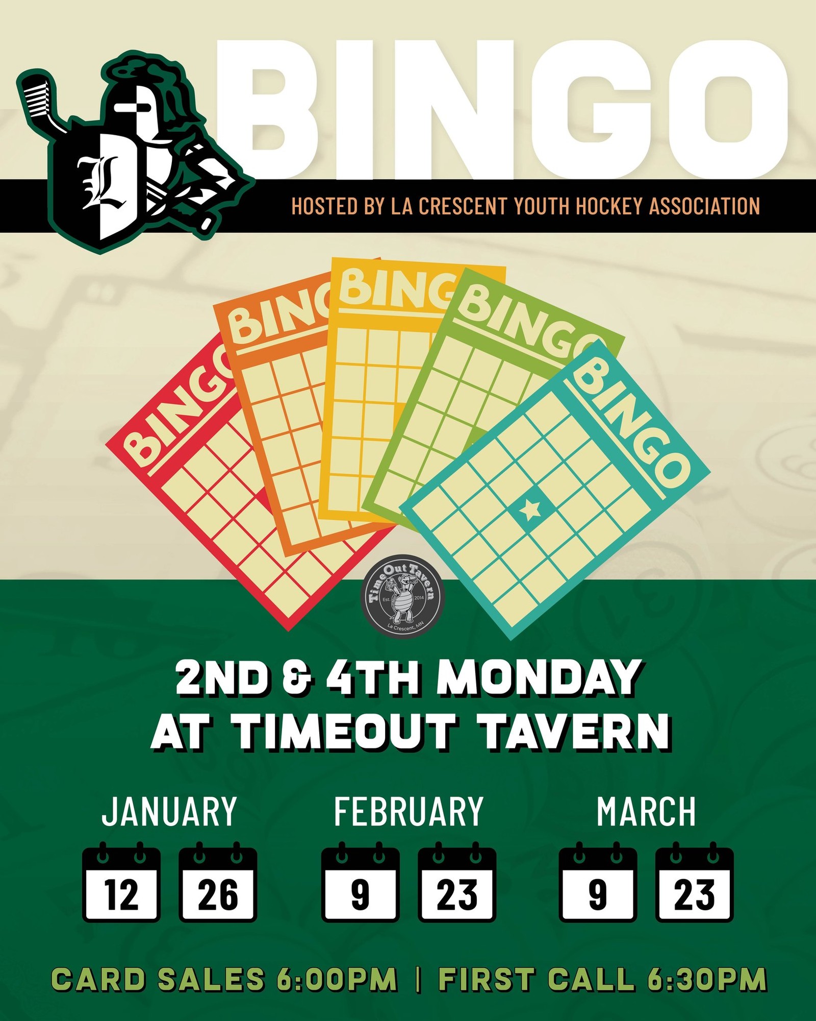 Bingo card sales begin at 6:00 pm, first call at 6:30 pm